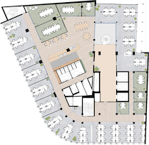 1 person / 15 m2 Workspaces: 67 (of which 10 closed) Meeting spaces: 41, Landing spots: 32